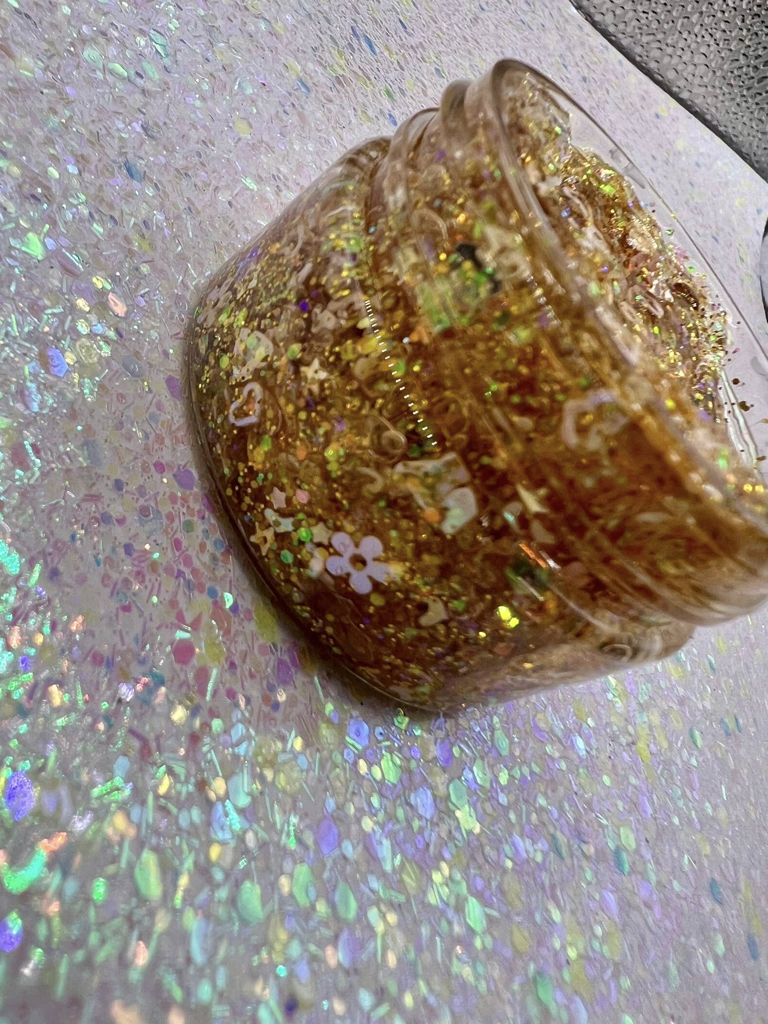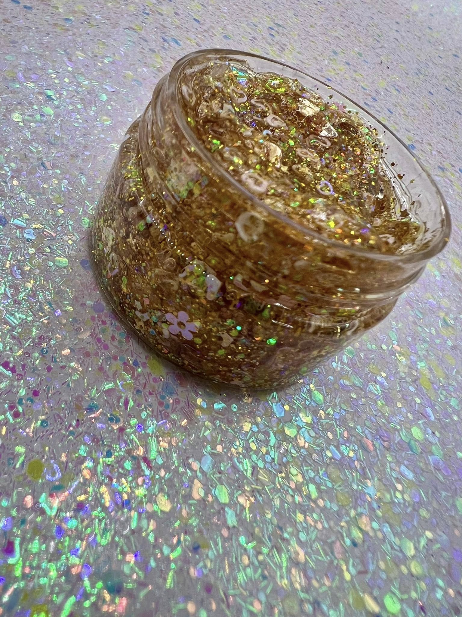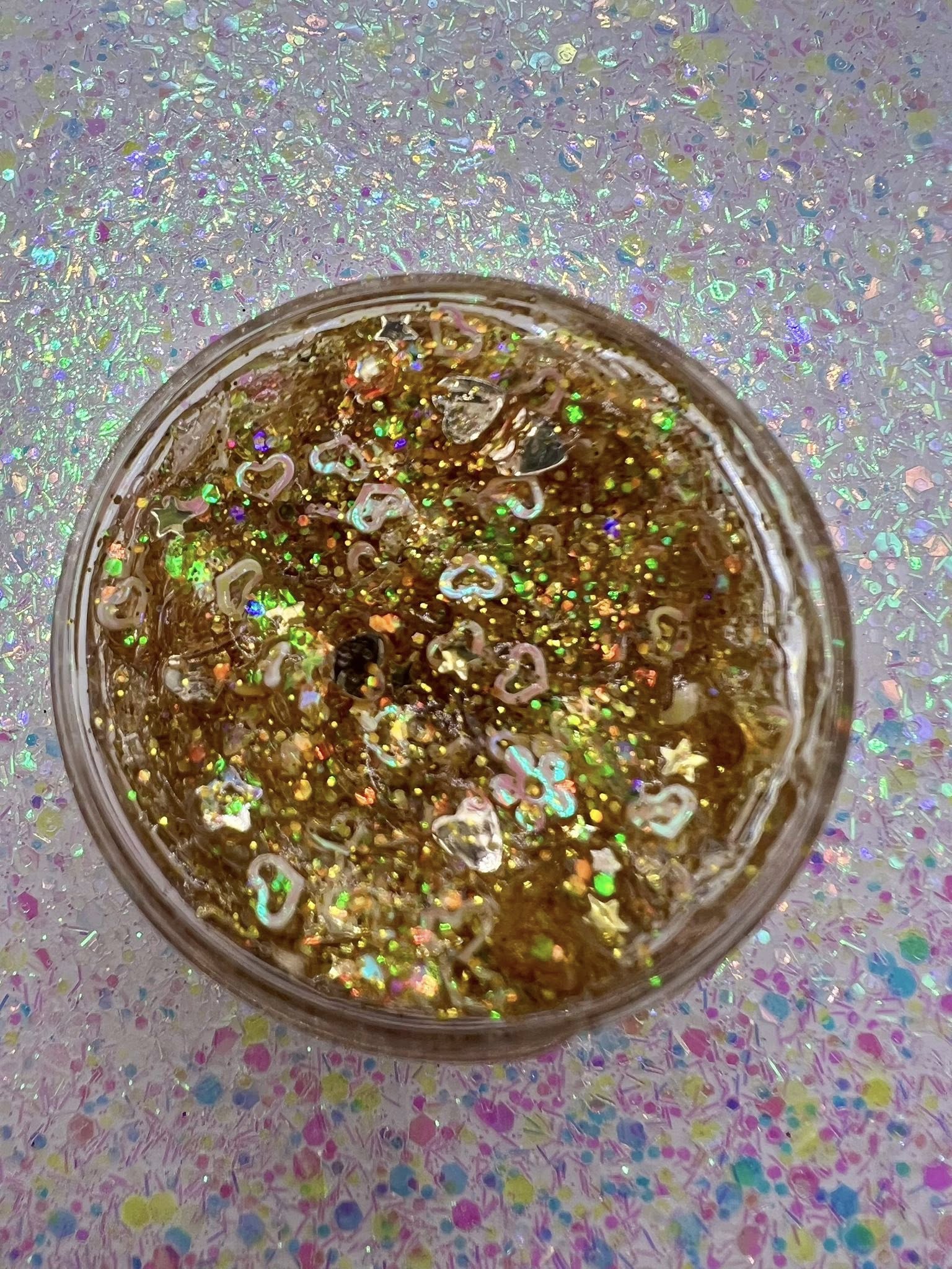 A clear base golden glitter gel packed with fun shapes.