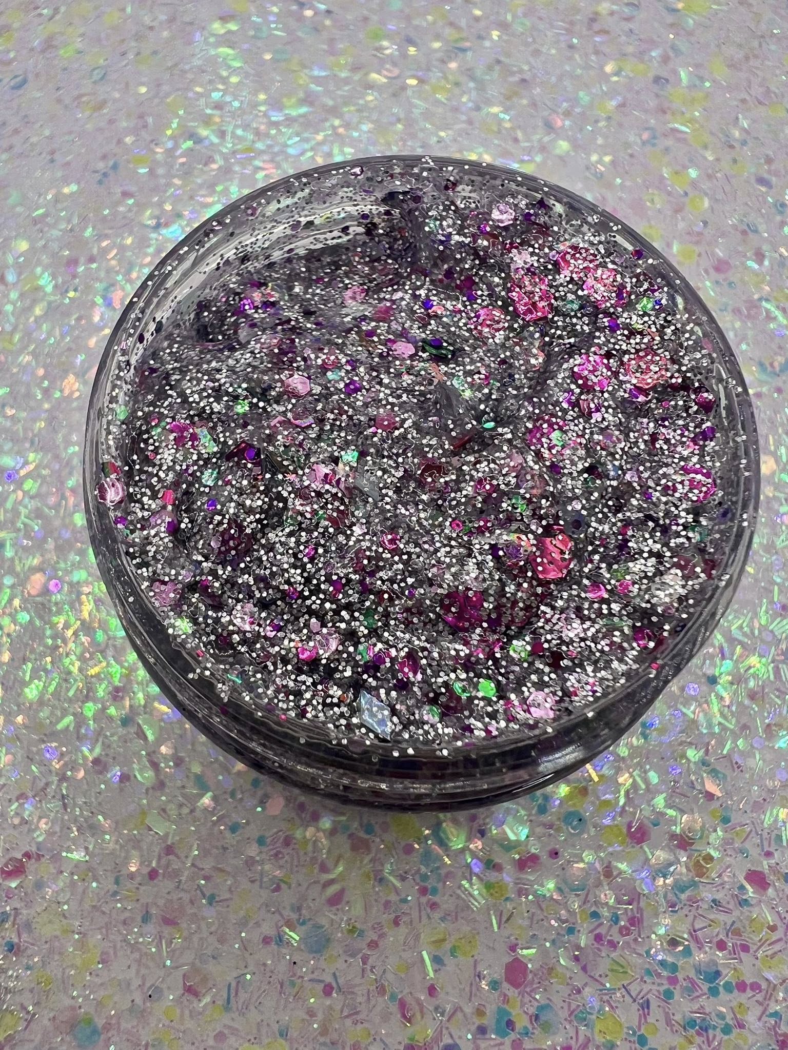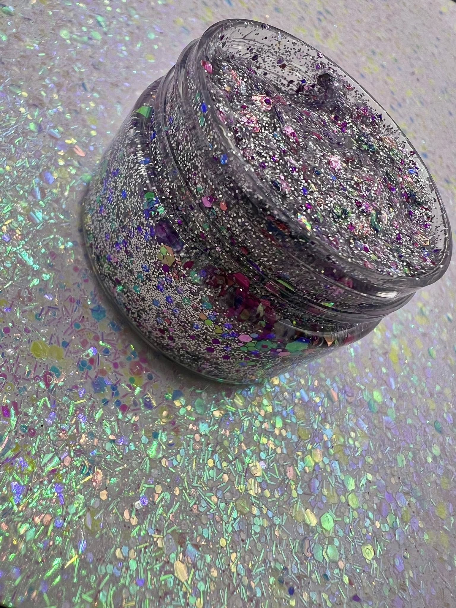 Like an explosion of silver and purple confetti!   A sparkle-packed glitter gel made for hair, face and body—totally safe, super gentle, and sticks like magic with no glue or primer needed! External use only.Keep out of eyes. Keep container closed or product may dry out. Apply with fingertips or a small brush. Remove with…